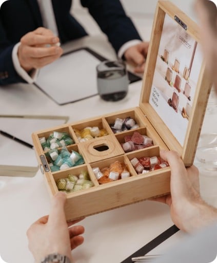 Boksen har 8 separate inndelinger for ulike smaker, samt et rom i midten for tomme waterdrop-kubepakker. Praktisk, fleksibel og designet for daglig bruk.